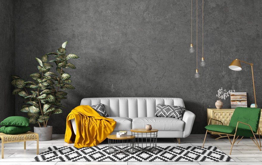 Do modnych i uniwersalnych rozwiązań należą także ściany w odcieniach bieli. Biała farba może mieć jednak atut w postaci ciekawej, dekoracyjnej struktury. Godne uwagi są choćby te dające fakturę baranka – kruszywo tworzące „ziarna” może być grubsze – wtedy efekt jest bardziej wyrazisty lub drobne tworzące delikatniejszą powłokę. Ponadczasowym aranżacjom służą farby dające wzór piaskowca – warto ich użyć, gdy decydujemy się na aranżację bliską stylowi rustykalnemu. W przeciwieństwie do naturalnego kamienia, taki „piaskowiec” łatwo usunąć, nie będzie też on podzielony na ścianie licznymi spoinami. W stylizacjach minimalistycznych, loftowych czy industrialnych warto zastosować na ścianach farby z efektem betonu architektonicznego, popularnie nazywane farbami betonowymi. Są one dostępne w kilku odcieniach szarości, można je również barwić za pomocą polecanych przez producenta kolorantów. Farby betonowe pozwalają uzyskać różne wzory płaszczyzn – poczynając od gładkiej błyszczącej przez powierzchnię pełną wżerów po design bliski okładzinom z płyt betonowych z charakterystycznymi spoinami. Wzory będą zależały w od sposobu nanoszenia farby.
