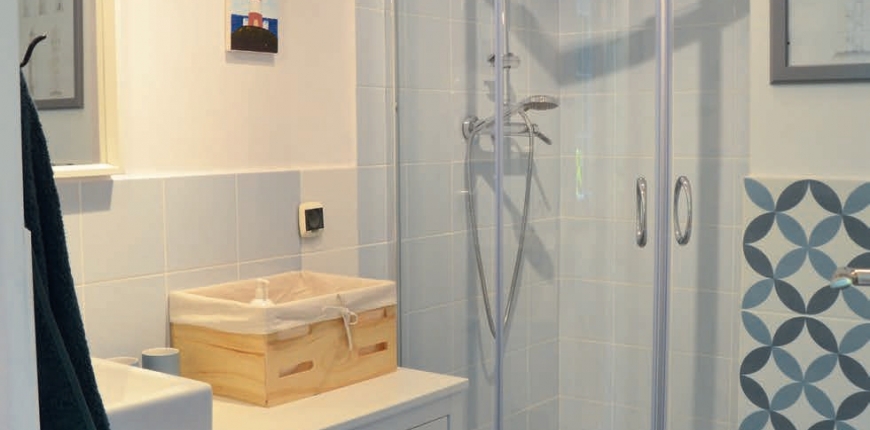 Kabina prysznicowa była zdecydowanie do wymiany! Wysoki brodzik z siedziskiem stracił swoją świeżość, zarówno z tytułu wieloletniej eksploatacji, jak i swojej niemodnej już formy. Chropowate drzwi kabiny z plastiku były trudne do czyszczenia i zabierały optycznie przestrzeń – w efekcie łazienka wydawała się wręcz przywalona ciężką wizualnie kabiną. Zastąpiła ją nowa, z niskim brodzikiem i całkowicie przejrzystymi szklanymi drzwiami. Gospodarze w sezonie również wynajmują dom gościom, dlatego zachowanie czystości jest rzeczą kluczową – drzwi kabiny pokryte są powłoką hydrofilną.