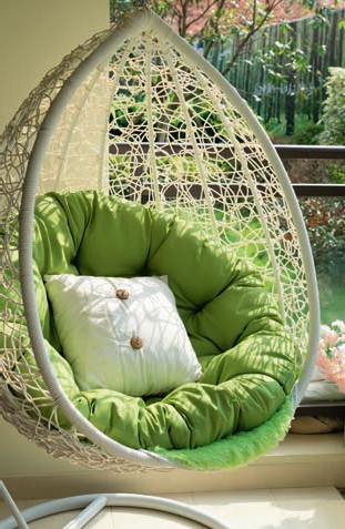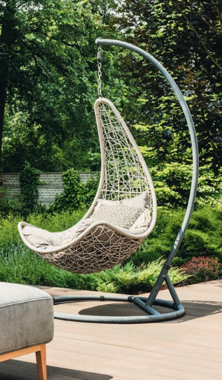 Nie do przecenienia będzie wygoda odpoczynku i bujania się w specjalnie na ten cel zaprojektowanym fotelu ogrodowym zwanym potocznie od kształtu, w jakim jest oferowany „kokonem”. Ogrodowy fotel zawieszony na stabilnej i wytrzymałej, stalowej ramie nie tylko pięknie wygląda w ogrodzie, ale jest niezwykle wygodny i idealnie nadaje się do relaksu, opalania czy nawet drzemki. Wykonany z rattanu, wikliny czy tworzywa głęboki kosz wypełniony miękkim materacem lub poduchami pozwala wygodnie zatopić się w jego wnętrzu, siedząc lub półleżąc. Ażurowa pleciona konstrukcja daje pełen dostęp powietrza, ale jednocześnie delikatne chroni przed słońcem czy mocnymi porywami wiatru. Fotel stanowi przyjazne schronienie i zapewnia poczucie odosobnienia. Ważnym elementem takiego siedziska jest stalowa rama – wspornik, na którym kosz jest zawieszony. Jego konstrukcja gwarantuje stabilność i zapewnia możliwość kołysania. Taki fotel jest bardzo atrakcyjny jako mebel ogrodowy, ponieważ można go przenosić i zmieniać towarzyszące relaksowi walory otoczenia, w którym mamy ochotę odpoczywać. Przy niepogodzie możemy również wstawić bujane siedzisko pod dach.