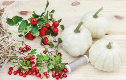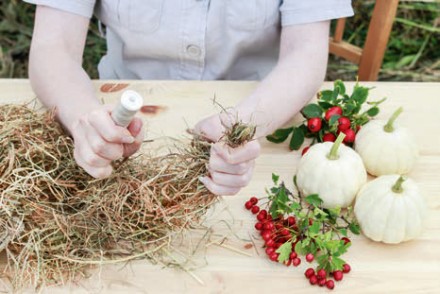1. Do przygotowania tej minimalistycznej, ale jakże sielskiej dekoracji potrzebne będą: nić pasmanteryjna lub florystyczna w kolorze jak najbardziej zbliżonym do przygotowanej przez nas wiązki suchej trawy (może być szara, écru, beżowa lub seledynowa); gałązki jesiennych owoców: dzika róża, kalina, głóg, jarzębina, dziurawiec, miechunka itp.; niewielkie ozdobne dynie lub tykwy w dowolnie wybranym kolorze; nieduży snopek suchej trawy o wytrzymałej niełamiącej się strukturze, np. suszona trawa morska.